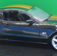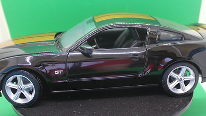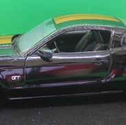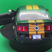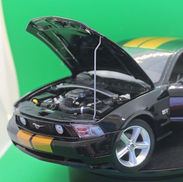 The paintwork is excellent. I like the metallic colour, and this is the same colour you would get on the real car, and care has been taken to ensure paint quality. There are no problems such as cracking or any bubbles with no chipping. This is a 2-door vehicle, and this model has both doors, bonnet and boot/trunk opens. The doors open reasonably well which gives a good look into the interior. Both doors are fitted well with excellent clearance and no over gaps. The external mirrors have been attached solidly, but still needs to be handled carefully. The main reason that models like these external parts is that they can break easily, and you cannot in most cases get replacement parts. The bonnet is a perfect fit. This is a premium model in which great care has been taken in the assembling of this model. The front of the model shows a distinctive radiator grill, but also it leaves no doubt that this is a Shelby Mustang. On the bottom air scoop and that famous cobra, this model shows us a powerful car. All the lights both front and rear have been fitted nicely. Those wheel rims with those tires are especially done in black and you can see the discs and also the brake callipers. All those decals have been done well to scale and fitted with care. And that includes the twin white stripes right from the front to the rear. The boot/trunk is fitted well and also opens reasonably. Nothing really to find fault with this model.
