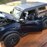 This model is a 1:18 Scale diecast-metal with some plastic parts. The Ford brand of 4x4 sports made Broncos are very much regarded as some of the best vehicles within this area. There have been a number of the Ford Bronco spinoffs that sometimes it's hard to keep up with. One of the many variants is our model, the Ford Bronco Wildtrak. Our model is painted in a very dark blue. In fact it's almost purple, but it displayed well with no areas that give any concern. Paint quality is excellent. The bodywork is good with all opening panels fitting well, however, the doors open wide enough to give a reasonable view of the interior, the same could not be said of the rear tailgate. This opens just a fraction and does not give a very good look into the rear of the vehicle. Otherwise the rest of the exterior fits very well with all components fitted firmly. The wheels with the tyres are one of the interesting aspects of this model, and feel almost like rubber but are in fact a soft plastic. But this does not distract from the model.